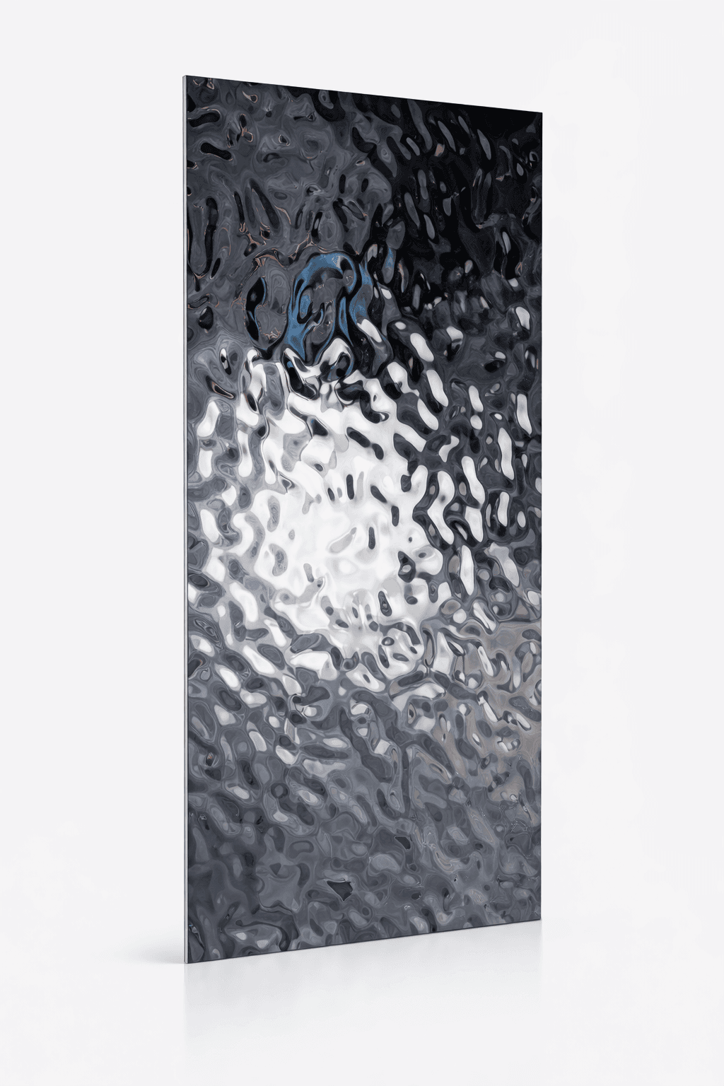 Superficie de estética líquida con reflejos ondulantes y un patrón irregular que evoca el movimiento del agua sobre metal pulido. Su acabado brillante genera profundidad visual y un efecto dinámico, ideal para proyectos contemporáneos que buscan impacto, luz y una presencia sofisticada.